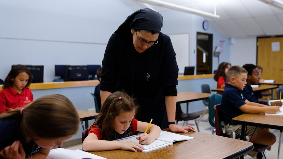 The Missionary Sisters of St. Charles Borromeo, founded in 2005, carry forward this same charism. Sister Marilú Arbesú additionally teaches Spanish, guides students through weekly small group girls’ lunches, and attends field trips. Sister Mariagrazia teaches middle school music and directs the choir, while Sister Sara serves as a learning specialist.